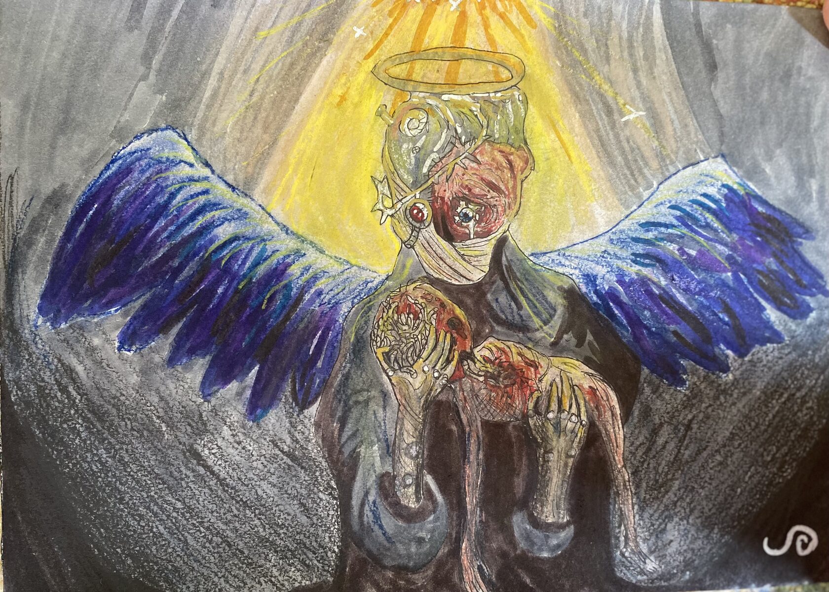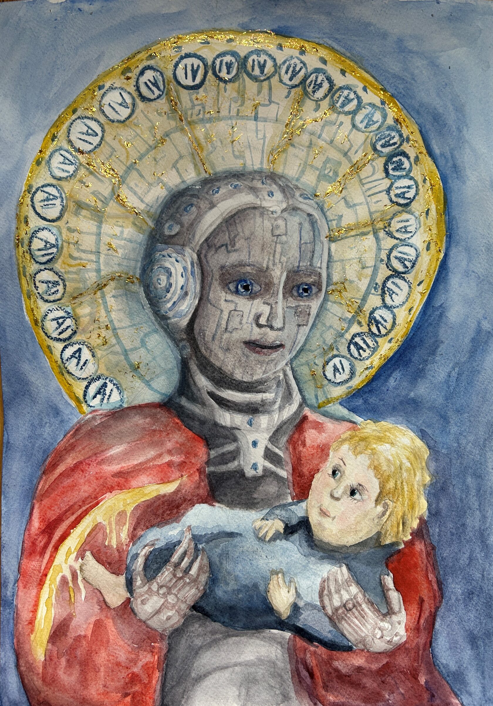 Inspired by iconography, this work explores the relationship between artificial intelligence and humanity. A humanoid figure with a digital halo holds a child, questioning whether technology can become a protector.
